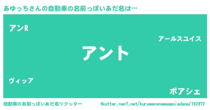 あゆっちさんの自動車の名前っぽいあだ名は… 『アント』『アンR』『ポアシェ』 ツクッター #自動車の名前っぽいあだ名ツクッター http://tkutter.nan7.net/kurumanonamaepoiadana/192872/