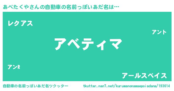 | 男性向けラノベタイトル風あだ名 | 『アベタクヤアートオンライン』 |