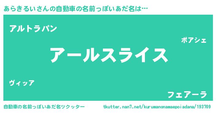 あらきるいさんの自動車の名前っぽいあだ名は… 『アールスライス』『アルトラパン』『フェアーラ』 ツクッター #自動車の名前っぽいあだ名ツクッター http://tkutter.nan7.net/kurumanonamaepoiadana/193709/