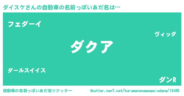ダイスケさんの自動車の名前っぽいあだ名は… 『ダクア』『フェダーイ』『ダンR』 ツクッター #自動車の名前っぽいあだ名ツクッター http://tkutter.nan7.net/kurumanonamaepoiadana/19485/