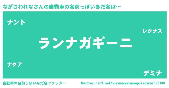 ながさわれなさんの自動車の名前っぽいあだ名は… 『ランナガギーニ』『ナント』『デミナ』 ツクッター #自動車の名前っぽいあだ名ツクッター http://tkutter.nan7.net/kurumanonamaepoiadana/195180/