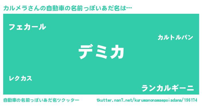 カルメラさんの自動車の名前っぽいあだ名は… 『デミカ』『フェカール』『ランカルギーニ』 ツクッター #自動車の名前っぽいあだ名ツクッター http://tkutter.nan7.net/kurumanonamaepoiadana/196174/