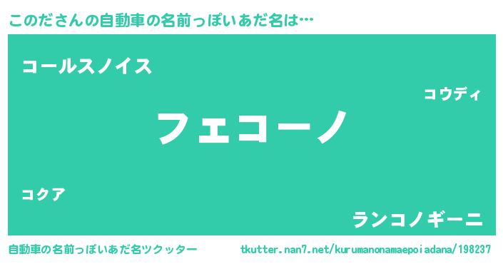 このださんの自動車の名前っぽいあだ名は… 『フェコーノ』『コールスノイス』『ランコノギーニ』 ツクッター #自動車の名前っぽいあだ名ツクッター http://tkutter.nan7.net/kurumanonamaepoiadana/198237/