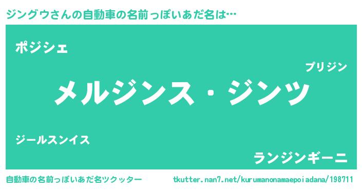 ジングウさんの自動車の名前っぽいあだ名は… 『メルジンス・ジンツ』『ポジシェ』『ランジンギーニ』 ツクッター #自動車の名前っぽいあだ名ツクッター http://tkutter.nan7.net/kurumanonamaepoiadana/198711/