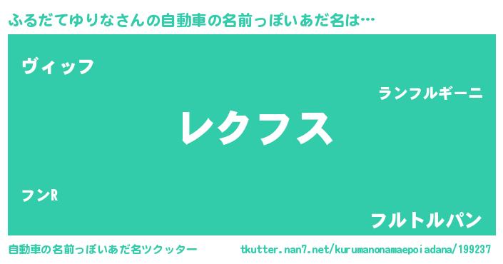 ふるだてゆりなさんの自動車の名前っぽいあだ名は… 『レクフス』『ヴィッフ』『フルトルパン』 ツクッター #自動車の名前っぽいあだ名ツクッター http://tkutter.nan7.net/kurumanonamaepoiadana/199237/