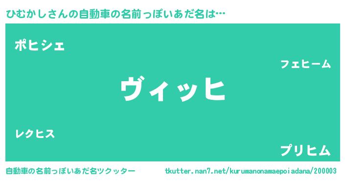 ひむかしさんの自動車の名前っぽいあだ名は… 『ヴィッヒ』『ポヒシェ』『プリヒム』 ツクッター #自動車の名前っぽいあだ名ツクッター http://tkutter.nan7.net/kurumanonamaepoiadana/200003/