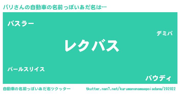 バリさんの自動車の名前っぽいあだ名は… 『レクバス』『バスラー』『バウディ』 ツクッター #自動車の名前っぽいあだ名ツクッター http://tkutter.nan7.net/kurumanonamaepoiadana/202022/