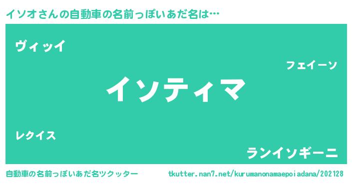 イソオさんの自動車の名前っぽいあだ名は… 『イソティマ』『ヴィッイ』『ランイソギーニ』 ツクッター #自動車の名前っぽいあだ名ツクッター http://tkutter.nan7.net/kurumanonamaepoiadana/202128/
