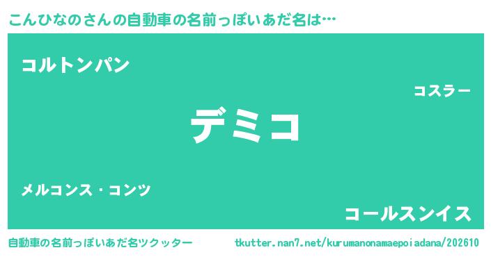 こんひなのさんの自動車の名前っぽいあだ名は… 『デミコ』『コルトンパン』『コールスンイス』 ツクッター #自動車の名前っぽいあだ名ツクッター http://tkutter.nan7.net/kurumanonamaepoiadana/202610/