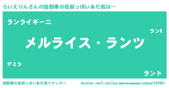 | 男性向けラノベタイトル風あだ名 | 『Re:らいえりんから始める異世界生活』 |
