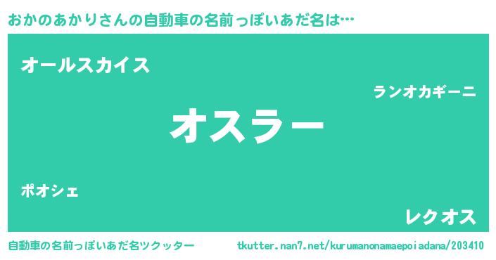 おかのあかりさんの自動車の名前っぽいあだ名は… 『オスラー』『オールスカイス』『レクオス』 ツクッター #自動車の名前っぽいあだ名ツクッター http://tkutter.nan7.net/kurumanonamaepoiadana/203410/