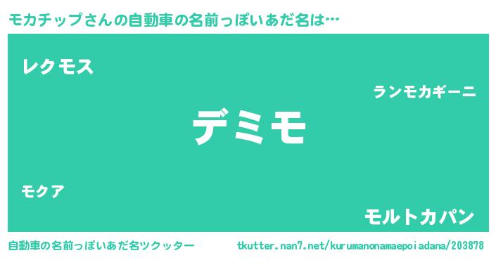 モカチップさんの自動車の名前っぽいあだ名は… 『デミモ』『レクモス』『モルトカパン』 ツクッター #自動車の名前っぽいあだ名ツクッター http://tkutter.nan7.net/kurumanonamaepoiadana/203878/