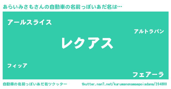 あらいみさもさんの自動車の名前っぽいあだ名は… 『レクアス』『アールスライス』『フェアーラ』 ツクッター #自動車の名前っぽいあだ名ツクッター http://tkutter.nan7.net/kurumanonamaepoiadana/204880/