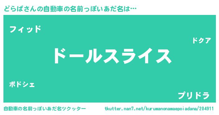 どらぱさんの自動車の名前っぽいあだ名は… 『ドールスライス』『フィッド』『プリドラ』 ツクッター #自動車の名前っぽいあだ名ツクッター http://tkutter.nan7.net/kurumanonamaepoiadana/204911/