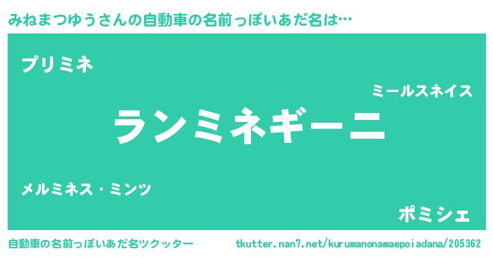 みねまつゆうさんの自動車の名前っぽいあだ名は… 『ランミネギーニ』『プリミネ』『ポミシェ』 ツクッター #自動車の名前っぽいあだ名ツクッター http://tkutter.nan7.net/kurumanonamaepoiadana/205362/