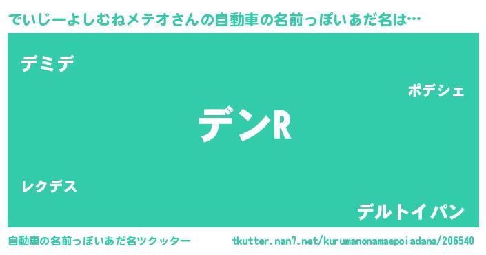 でいじーよしむねメテオさんの自動車の名前っぽいあだ名は… 『デンR』『デミデ』『デルトイパン』 ツクッター #自動車の名前っぽいあだ名ツクッター http://tkutter.nan7.net/kurumanonamaepoiadana/206540/