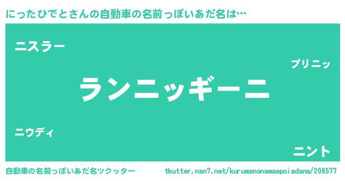 にったひでとさんの自動車の名前っぽいあだ名は… 『ランニッギーニ』『ニスラー』『ニント』 ツクッター #自動車の名前っぽいあだ名ツクッター http://tkutter.nan7.net/kurumanonamaepoiadana/206577/