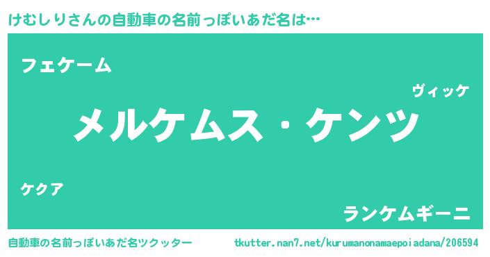けむしりさんの自動車の名前っぽいあだ名は… 『メルケムス・ケンツ』『フェケーム』『ランケムギーニ』 ツクッター #自動車の名前っぽいあだ名ツクッター http://tkutter.nan7.net/kurumanonamaepoiadana/206594/