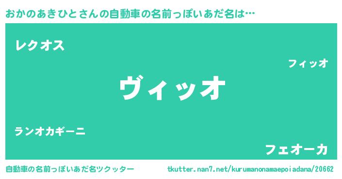 おかのあきひとさんの自動車の名前っぽいあだ名は… 『ヴィッオ』『レクオス』『フェオーカ』 ツクッター #自動車の名前っぽいあだ名ツクッター http://tkutter.nan7.net/kurumanonamaepoiadana/20662/