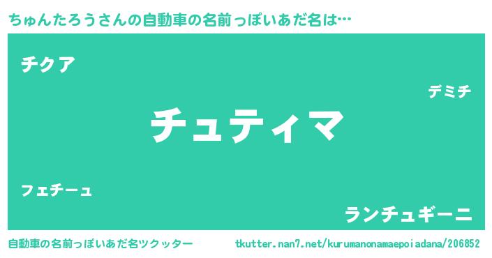 ちゅんたろうさんの自動車の名前っぽいあだ名は… 『チュティマ』『チクア』『ランチュギーニ』 ツクッター #自動車の名前っぽいあだ名ツクッター http://tkutter.nan7.net/kurumanonamaepoiadana/206852/