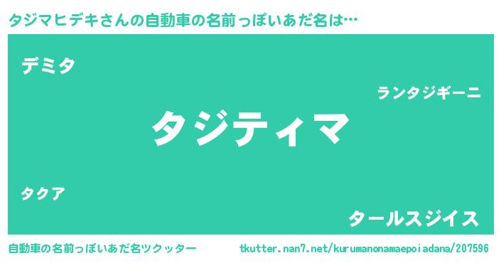 タジマヒデキさんの自動車の名前っぽいあだ名は… 『タジティマ』『デミタ』『タールスジイス』 ツクッター #自動車の名前っぽいあだ名ツクッター http://tkutter.nan7.net/kurumanonamaepoiadana/207596/