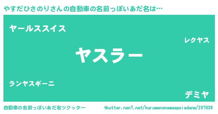 やすだひさのりさんの自動車の名前っぽいあだ名は… 『ヤスラー』『ヤールススイス』『デミヤ』 ツクッター #自動車の名前っぽいあだ名ツクッター http://tkutter.nan7.net/kurumanonamaepoiadana/207638/