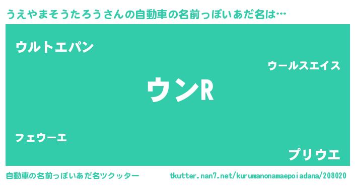うえやまそうたろうさんの自動車の名前っぽいあだ名は… 『ウンR』『ウルトエパン』『プリウエ』 ツクッター #自動車の名前っぽいあだ名ツクッター http://tkutter.nan7.net/kurumanonamaepoiadana/208020/