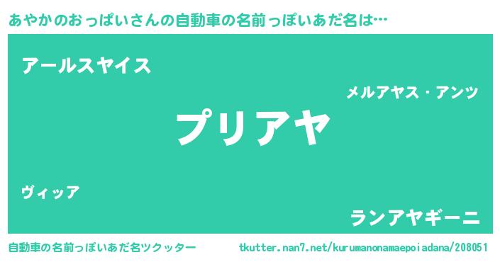 あやかのおっぱいさんの自動車の名前っぽいあだ名は… 『プリアヤ』『アールスヤイス』『ランアヤギーニ』 ツクッター #自動車の名前っぽいあだ名ツクッター http://tkutter.nan7.net/kurumanonamaepoiadana/208051/