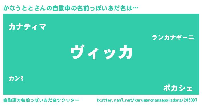 かなうととさんの自動車の名前っぽいあだ名は… 『ヴィッカ』『カナティマ』『ポカシェ』 ツクッター #自動車の名前っぽいあだ名ツクッター http://tkutter.nan7.net/kurumanonamaepoiadana/208307/