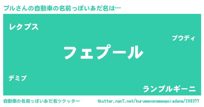 プルさんの自動車の名前っぽいあだ名は… 『フェプール』『レクプス』『ランプルギーニ』 ツクッター #自動車の名前っぽいあだ名ツクッター http://tkutter.nan7.net/kurumanonamaepoiadana/208377/
