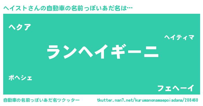 ヘイストさんの自動車の名前っぽいあだ名は… 『ランヘイギーニ』『ヘクア』『フェヘーイ』 ツクッター #自動車の名前っぽいあだ名ツクッター http://tkutter.nan7.net/kurumanonamaepoiadana/208460/