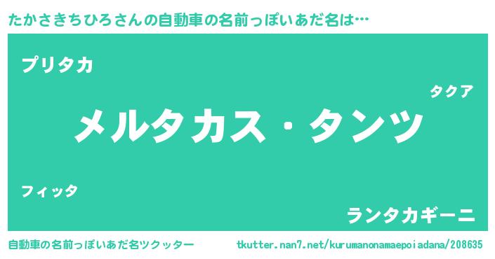 たかさきちひろさんの自動車の名前っぽいあだ名は… 『メルタカス・タンツ』『プリタカ』『ランタカギーニ』 ツクッター #自動車の名前っぽいあだ名ツクッター http://tkutter.nan7.net/kurumanonamaepoiadana/208635/