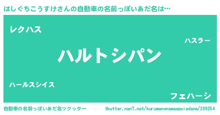 はしぐちこうすけさんの自動車の名前っぽいあだ名は… 『ハルトシパン』『レクハス』『フェハーシ』 ツクッター #自動車の名前っぽいあだ名ツクッター http://tkutter.nan7.net/kurumanonamaepoiadana/209254/