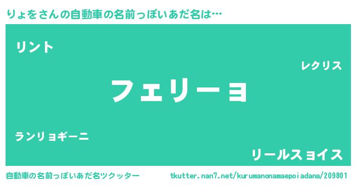 りょをさんの自動車の名前っぽいあだ名は… 『フェリーョ』『リント』『リールスョイス』 ツクッター #自動車の名前っぽいあだ名ツクッター http://tkutter.nan7.net/kurumanonamaepoiadana/209801/