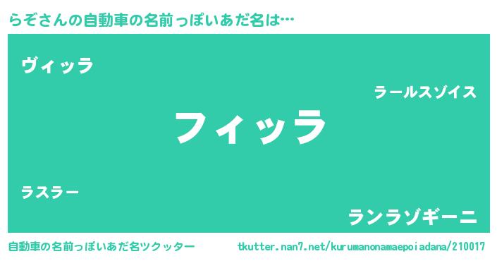 らぞさんの自動車の名前っぽいあだ名は… 『フィッラ』『ヴィッラ』『ランラゾギーニ』 ツクッター #自動車の名前っぽいあだ名ツクッター http://tkutter.nan7.net/kurumanonamaepoiadana/210017/