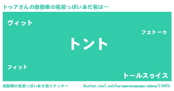 トゥアさんの自動車の名前っぽいあだ名は… 『トント』『ヴィット』『トールスゥイス』 ツクッター #自動車の名前っぽいあだ名ツクッター http://tkutter.nan7.net/kurumanonamaepoiadana/210073/