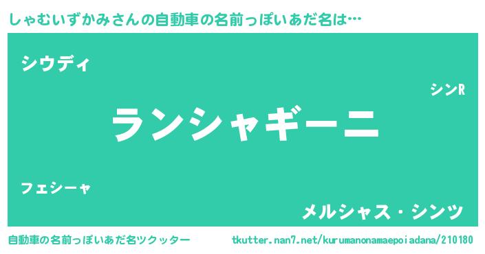 しゃむいずかみさんの自動車の名前っぽいあだ名は… 『ランシャギーニ』『シウディ』『メルシャス・シンツ』 ツクッター #自動車の名前っぽいあだ名ツクッター http://tkutter.nan7.net/kurumanonamaepoiadana/210180/