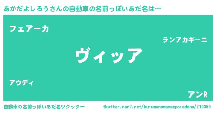 あかだよしろうさんの自動車の名前っぽいあだ名は… 『ヴィッア』『フェアーカ』『アンR』 ツクッター #自動車の名前っぽいあだ名ツクッター http://tkutter.nan7.net/kurumanonamaepoiadana/210369/