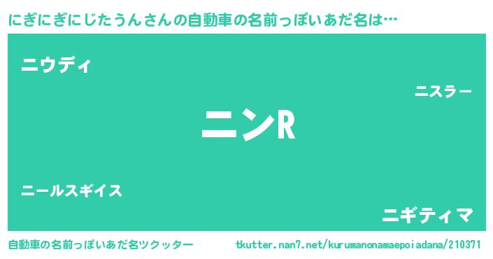 にぎにぎにじたうんさんの自動車の名前っぽいあだ名は… 『ニンR』『ニウディ』『ニギティマ』 ツクッター #自動車の名前っぽいあだ名ツクッター http://tkutter.nan7.net/kurumanonamaepoiadana/210371/