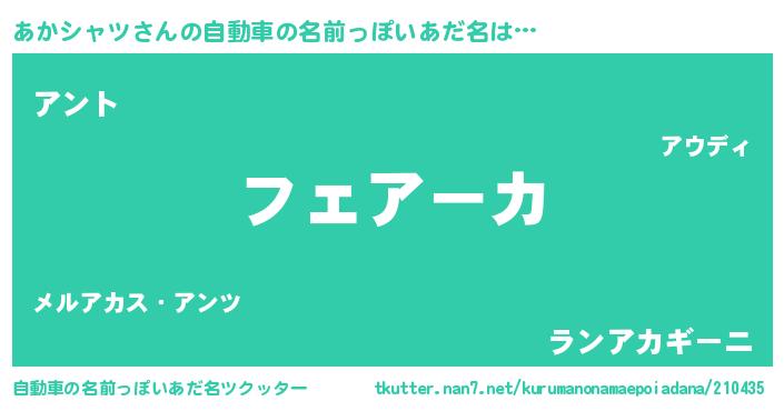 あかシャツさんの自動車の名前っぽいあだ名は… 『フェアーカ』『アント』『ランアカギーニ』 ツクッター #自動車の名前っぽいあだ名ツクッター http://tkutter.nan7.net/kurumanonamaepoiadana/210435/