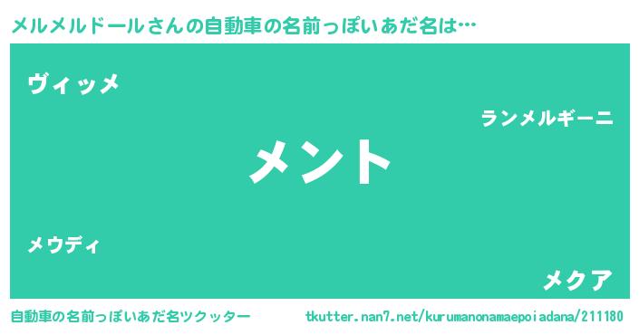 | 男性向けラノベタイトル風あだ名 | 『メルメルドールの嫁は女の子じゃないと思った?』 |