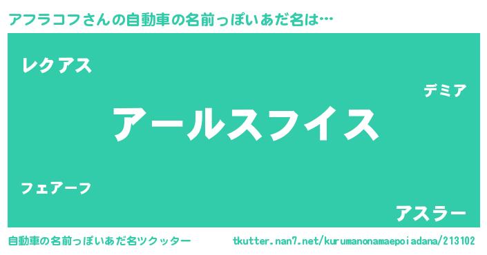 | 女子向けラノベタイトル風あだ名 | 『アフラコフの玉の輿計画!』 |