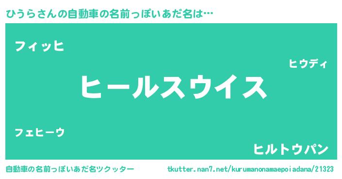 ひうらさんの自動車の名前っぽいあだ名は… 『ヒールスウイス』『フィッヒ』『ヒルトウパン』 ツクッター #自動車の名前っぽいあだ名ツクッター http://tkutter.nan7.net/kurumanonamaepoiadana/21323/