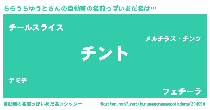 | 男性向けラノベタイトル風あだ名 | 『ちらうちゆうとの嫁は女の子じゃないと思った?』 |