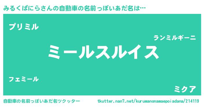 | 男性向けラノベタイトル風あだ名 | 『転生したらみるくばにらだった件』 |