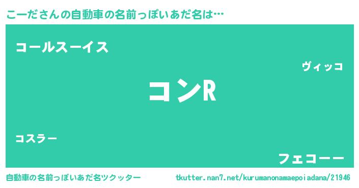 こーださんの自動車の名前っぽいあだ名は… 『コンR』『コールスーイス』『フェコーー』 ツクッター #自動車の名前っぽいあだ名ツクッター http://tkutter.nan7.net/kurumanonamaepoiadana/21946/