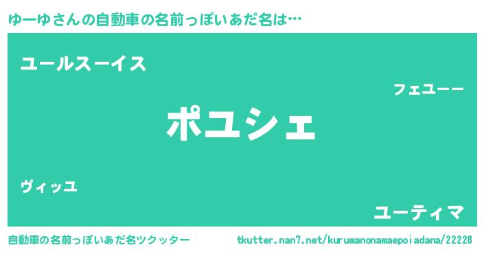 ゆーゆさんの自動車の名前っぽいあだ名は… 『ポユシェ』『ユールスーイス』『ユーティマ』 ツクッター #自動車の名前っぽいあだ名ツクッター http://tkutter.nan7.net/kurumanonamaepoiadana/22228/