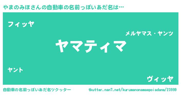 やまのみほさんの自動車の名前っぽいあだ名は… 『ヤマティマ』『フィッヤ』『ヴィッヤ』 ツクッター #自動車の名前っぽいあだ名ツクッター http://tkutter.nan7.net/kurumanonamaepoiadana/23999/