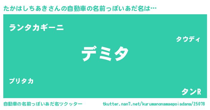 たかはしちあきさんの自動車の名前っぽいあだ名は… 『デミタ』『ランタカギーニ』『タンR』 ツクッター #自動車の名前っぽいあだ名ツクッター http://tkutter.nan7.net/kurumanonamaepoiadana/25078/