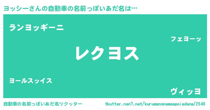 ヨッシーさんの自動車の名前っぽいあだ名は… 『レクヨス』『ランヨッギーニ』『ヴィッヨ』 ツクッター #自動車の名前っぽいあだ名ツクッター http://tkutter.nan7.net/kurumanonamaepoiadana/2540/